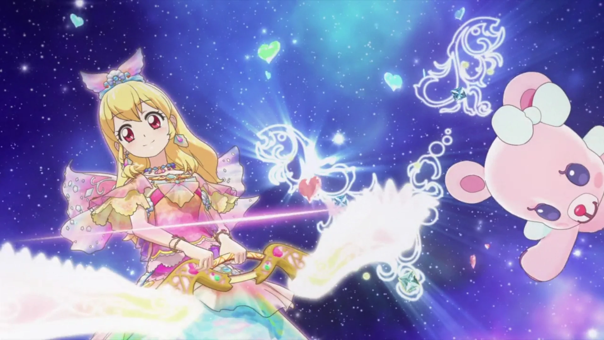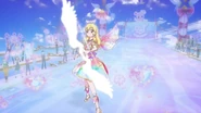 The user is holding an angelic bow and summons an arrow which they release towards a large heart-shaped balloon. When the arrow collides with heart, it pops and scatters into multiple, different-colored, mini-hearts. The backgrounds are normally a cloudy sky that turns from blue to pink. The user poses after bursting the balloon and ribbons float around the backdrop and the hearts are also pastel gems. In the Constellation form, the hearts return to their original style with Pisces backgrounds.