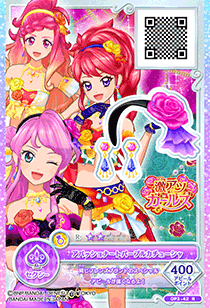 Appassionato Red Coord (アパッショナートパープルコーデ) is a rare coord made by the unit-brand Super-Hot Girls and is Maika Chōno's Super-Hot Girls Unit Coord. It debuted in Part 3 of the Data Carddass Aikatsu on Parade! series and made a cameo appearance in Episode 16 of the anime.
