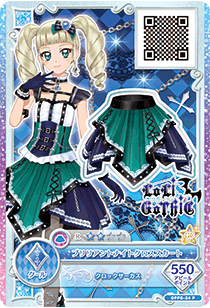Brilliant Night Cross Coord (ブリリアントナイトクロスコーデ) is a rare coord made by the cool brand Loli Gothic. It debuted in Part 3 of the promotional collection of the Data Carddass Aikatsu on Parade! series and did not appear in the anime. It shares its design with the Deep Night Cross Coord.