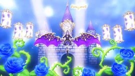 For Fever appeal, the idol summons a large castle with thorn vines beneath her. She spreads her arms apart before posing as the clock changes. When it reaches midnight, large bat wings appear behind her.