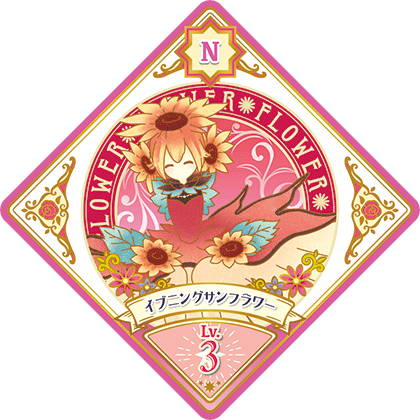 Evening Sunflower (イブニングサンフラワー) is a Flower attributed Dressia. It debuted in Part 5 of the Data Carddass Aikatsu Planet! series and Episode ML6 of the web series.