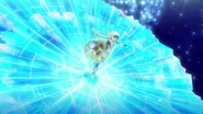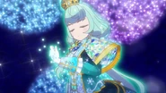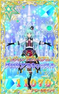 The idols stand in front of the dark purple ices background and her left hand appears a green glow. She put her left hand up and start spinning. When she is spinning, some light blue snows which surround by some snowflakes are following her hands. She tramples the ground and the ground is frozen quickly and becomes an ice castle and she poses in front of the castle and blue sky. Some ices and golden or silver snowflakes with green gems are surrounding her.