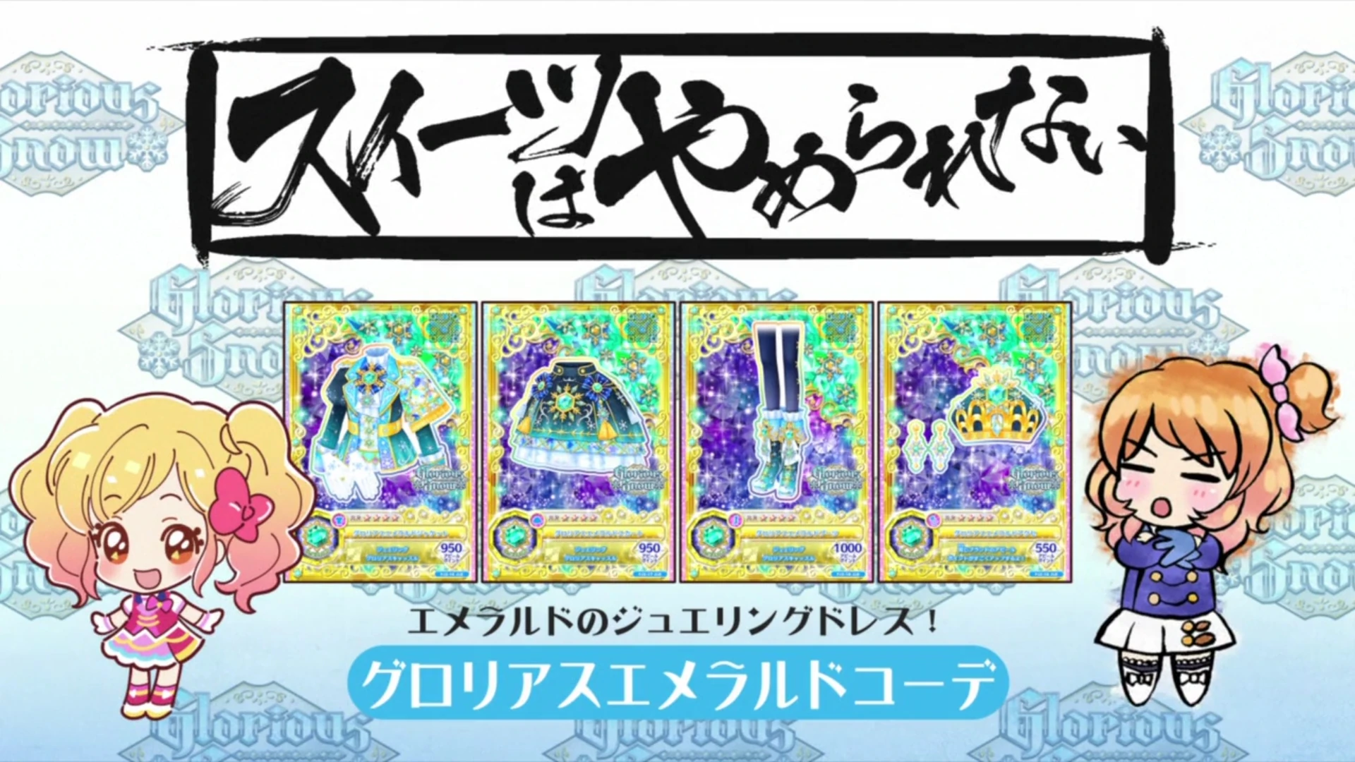 Glorious Emerald Coord (グロリアスエメラルドコーデ) is a jeweling rare coord by the cool brand Glorious Snow. It first debuted in Part 2 of the Data Carddass Aikatsu Friends! Brilliant Jewel series.