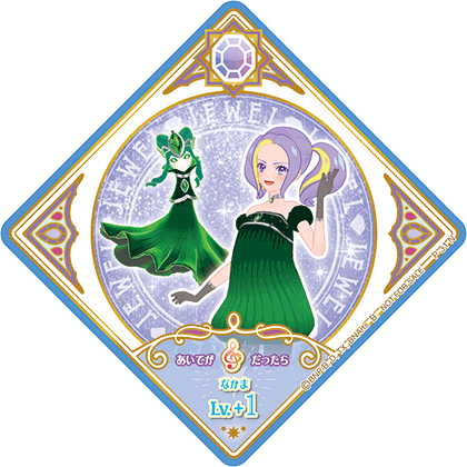 Green Garnet (グリーンガーネット) is a Jewel attributed Dressia. It debuted in Part 2 of the promotional collection of the Data Carddass Aikatsu Planet! series and has yet to be seen in the live-action and anime.