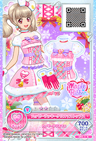 Happy Lucky Christmas Coord (ハッピーラッキークリスマスコーデ) is a rare coord made by the brand Maple Ribbon. It debuted in Part 2 of the Data Carddass Aikatsu on Parade! series and has yet to be seen in the anime. It shares its design with the Fancy Lucky Christmas Coord.