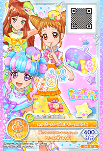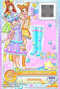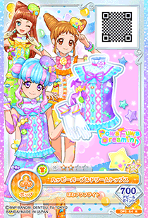 Happy Purple Dream Coord (ハッピーパープルドリームコーデ) is a rare coord made by the unit-brand PowaFuwa Dreamin'♪ and is Kirara Hanazono’s PowaFuwa Dreamin'♪ Unit Coord. It debuted in Part 3 of the Data Carddass Aikatsu on Parade! series and made a cameo appearance in Episode 15 of the anime.