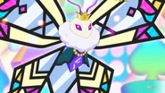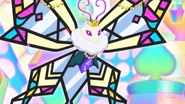 A Dressia that resembles a butterfly or moth with an amethyst gem body to match its eyes. It has glittery purple antennae and wears a gold crown. Around its neck is white fluff, a gold bead necklace is tucked beneath it and ruffled, glittery black material. The wings resemble stained glass with gold bead chains draped around the top.