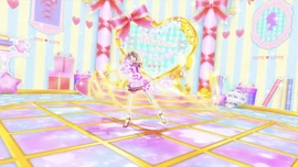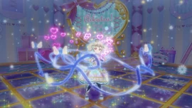 In Episode 13, violet ribbons that form bows and hearts go around her. Violet stars with angel wings spin in place. They turn translucent white and fade away. Yellow, blue and pink sparkles float around her. She also has a light violet glow. | |
