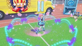 Aine's musical notes, Mio's geometric spheres, Maika's butterflies and Ema's spiked balls form a ring around them. Sheer spheres and fireworks fly above them. Each idol glows a color in their idol type. | |