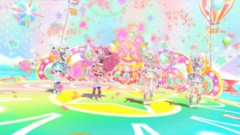 Yellow or orange jewel cats, and red or yellow lollipops that have electric purple ribbons circle around them. Fireworks and shimmers can also be seen above. Maika bears a purple glow while Ema bears a yellow glow. |