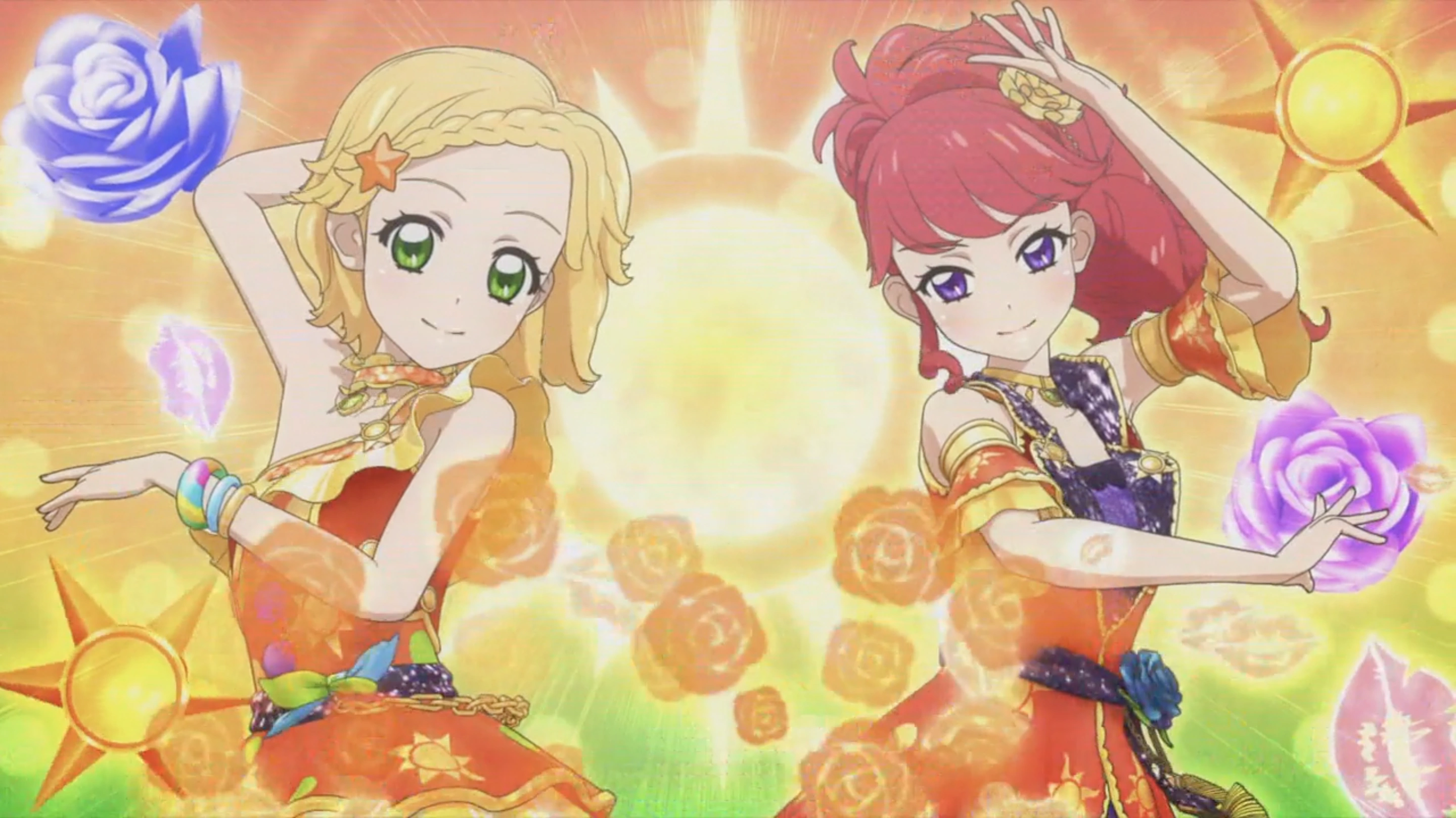 Juri and Hinaki fly up while being surrounded by pink, purple and blue roses, spiraling around each other, leaving behind yellow and orange trails with their hands. The final pose is flamenco style, back to back with a sun between in the background. Blue, purple and smaller orange roses litter the orange background while two suns appear in the top right and bottom left corners.