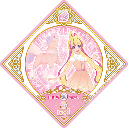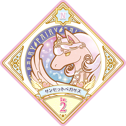Sunset Pegasus (サンセットペガサス) is a Fairy attributed Dressia. It debuted in Part 2 of the promotional collection of the Data Carddass Aikatsu Planet! series and has yet to be seen in the live-action and anime.