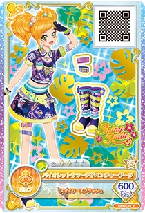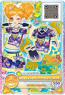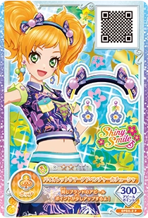 Violet Summer Adventure Coord (バイオレットサマーアドベンチャーカコーデ) is a rare coord by the pop brand Shiny Smile. It debuted in Part 2 of the promotional collection of the Data Carddass Aikatsu on Parade! series and did not appear in the anime. It shares its design with the Orange Summer Adventure Coord.