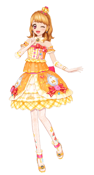 An orange top with a light gold pattern of vertical lines, crown and keys. Gold lines the bottom, and around the abdomen is ruffled gold fabric. Layers of white frills and fabric goes down the middle of the chest with three pink and gold buttons and gold lining. Around the top of the chest is a apricot strip trim with gold lace, on the corner is a red and gold ribbon with a smaller apricot and white striped ribbon under it. An aquamarine sphere hangs from it. The ruffled orange off-shoulder sleeve is lined in gold with a gold lace layer beneath it. Around the middle is a pearl chain with a tiny navy bow. The vanilla choker has a red piece on each side, at the middle is a dark blue brooch with a gold and red crown. The lace gloves have a gold band and ruffled trim. On one wrist are two gold bracelets, one with an aquamarine.
